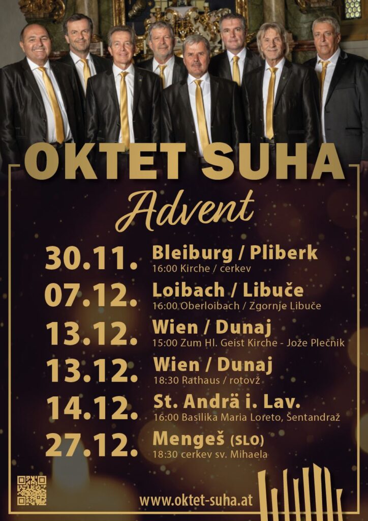 Fast schon zu einer kleinen Adventstournee haben sich die Auftritte des Oktet Suha im Advent 2025 entwickelt. Gleich zweimal sind wir in Wien zu hören – im Rathaus und in der wunderschönen Plečnik-Kirche im 16. Bezirk. Im Lavanttal, in St. Andrä, singen wir im Rahmen des Stillen Advents für den guten Zweck. Und auch in Mengeš (Slowenien) erwartet das Publikum ein besonderes Programm mit weihnachtlichen Liedern aus Südkärnten. Den Auftakt unserer Adventsreise bildet Bleiburg/Pliberk und Oberloibach/Zgornje Libuče, wo wir auf Einladung unserer befreundeten Gruppen NOVUM und Kralj Matjaž den Advent musikalisch eröffnen dürfen. Wir laden alle herzlich ein, diese besonderen Momente mit uns zu teilen!