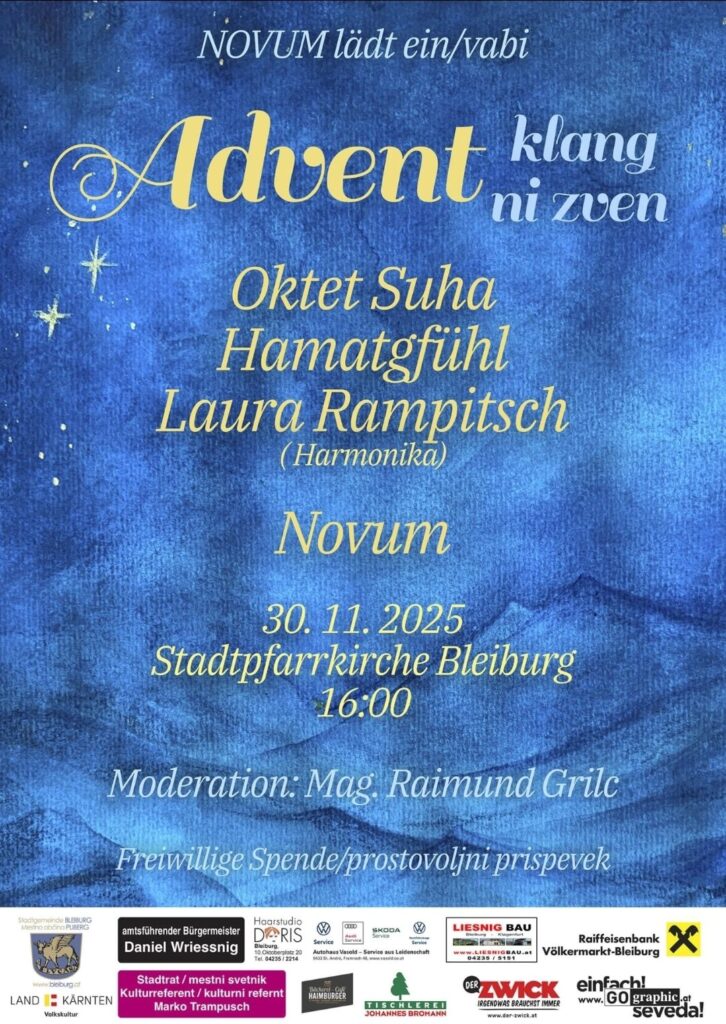 Pod geslom „Adventni zven | Adventklang“ je vokalna skupina Novum na prvo adventno nedeljo vabila v pliberško farno cerkev na koncert. V mistični osvetljavi neštetih sveč smo številno publiko glasbeno popeljali v predbožično razpoloženje skupini NOVOM in Hamatfühl, Oktet Suha in Laura Rampitsch s svojo harmoniko. Lepo je bilo.